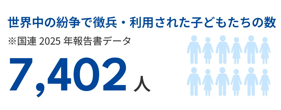 国連の最新報告書によると、2024年だけでも、世界中の紛争で7,402人もの子どもたちが兵士として徴兵・利用されたことが確認されています。