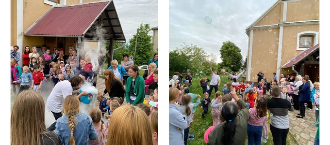 CSCsの一環で、パフォーマンスができる方に、避難所でのパフォーマンスを依頼しています。5月最後の日曜日、ヨーロッパの「子どもの日」に、キシュセルメンツ村に避難している避難民の子ども達を教会に呼びました。ミサの後、お菓子のプレゼントとシャボン玉パフォーマンスを堪能してもらいました。この日は、地元の子ども達と避難民の子ども達、約60名が参加してくださり、熱狂するほど大喜びしてくれました。