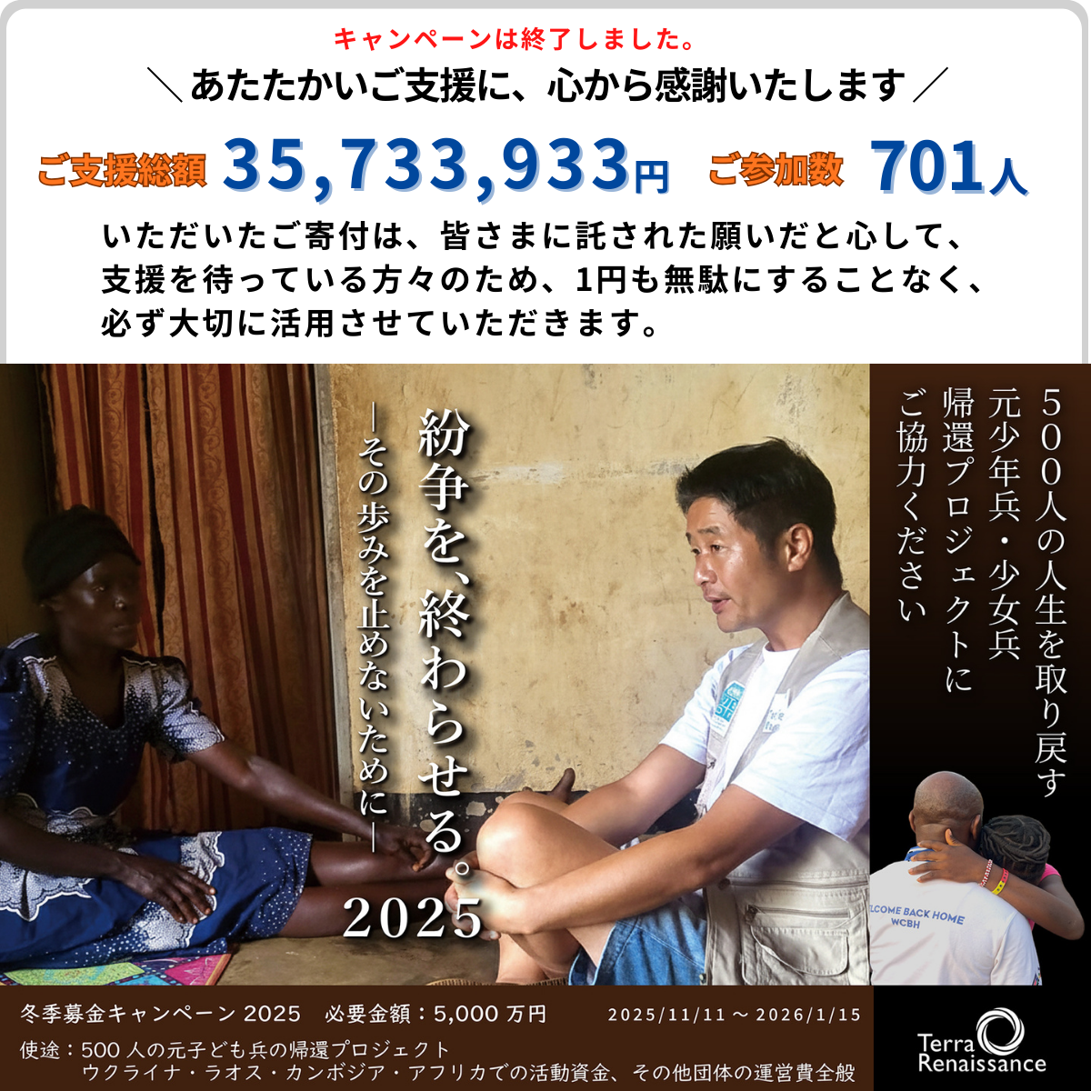いつもテラ・ルネッサンスを温かく支えてくださり、誠にありがとうございます。 2025年冬、皆さまからご寄付を通して託していただいた多くの「願い」は、確実に海を越え、平和をつくる「チカラ」へと変わっています。