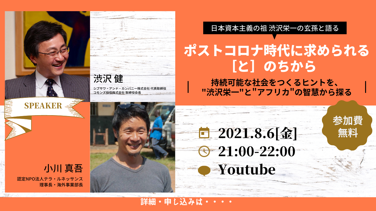 【音声対談】【08/06(金)】ポストコロナ時代に求められる[と]のちから ー持続可能な社会をつくるヒントを、渋沢栄一とアフリカの智慧から探るー▶渋沢健✕小川真吾✕鬼丸昌也