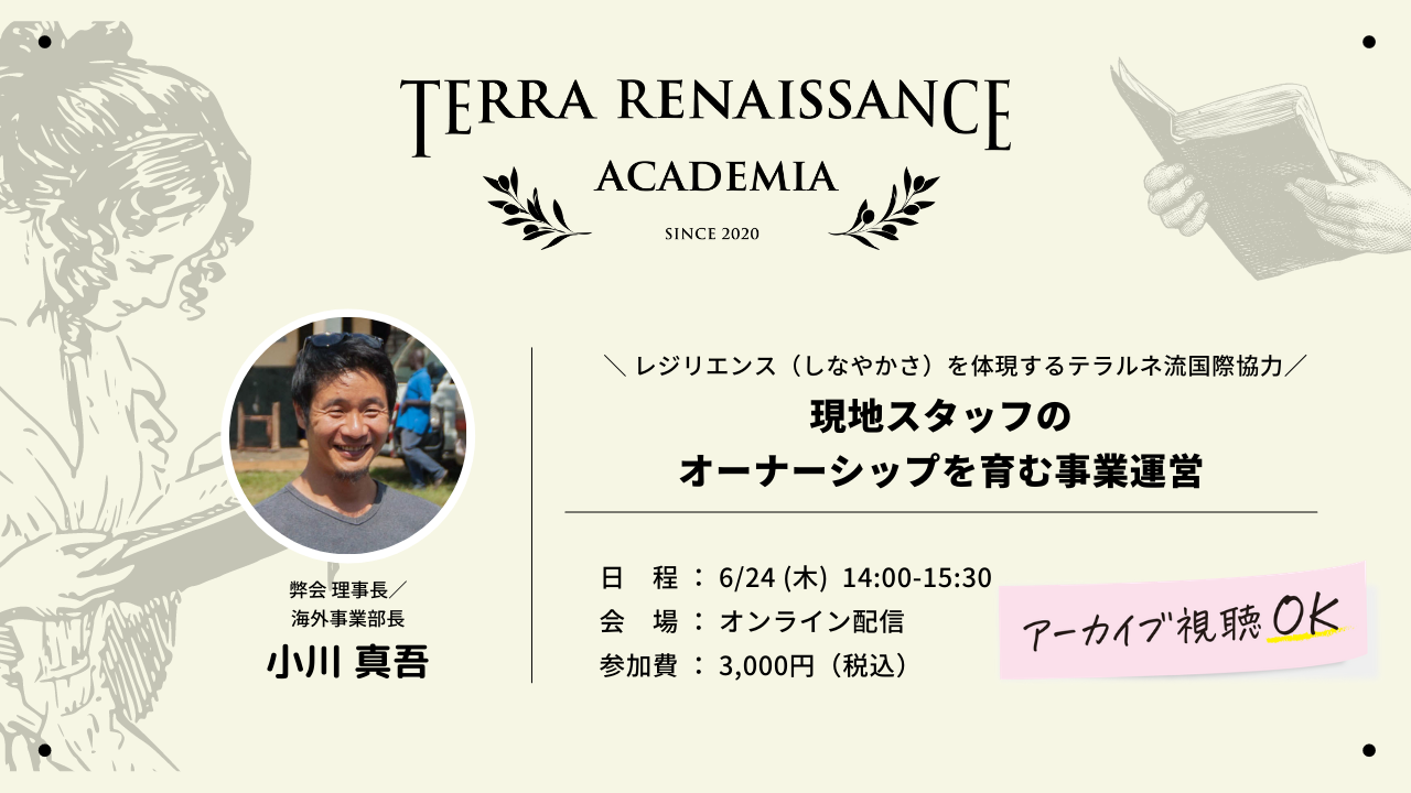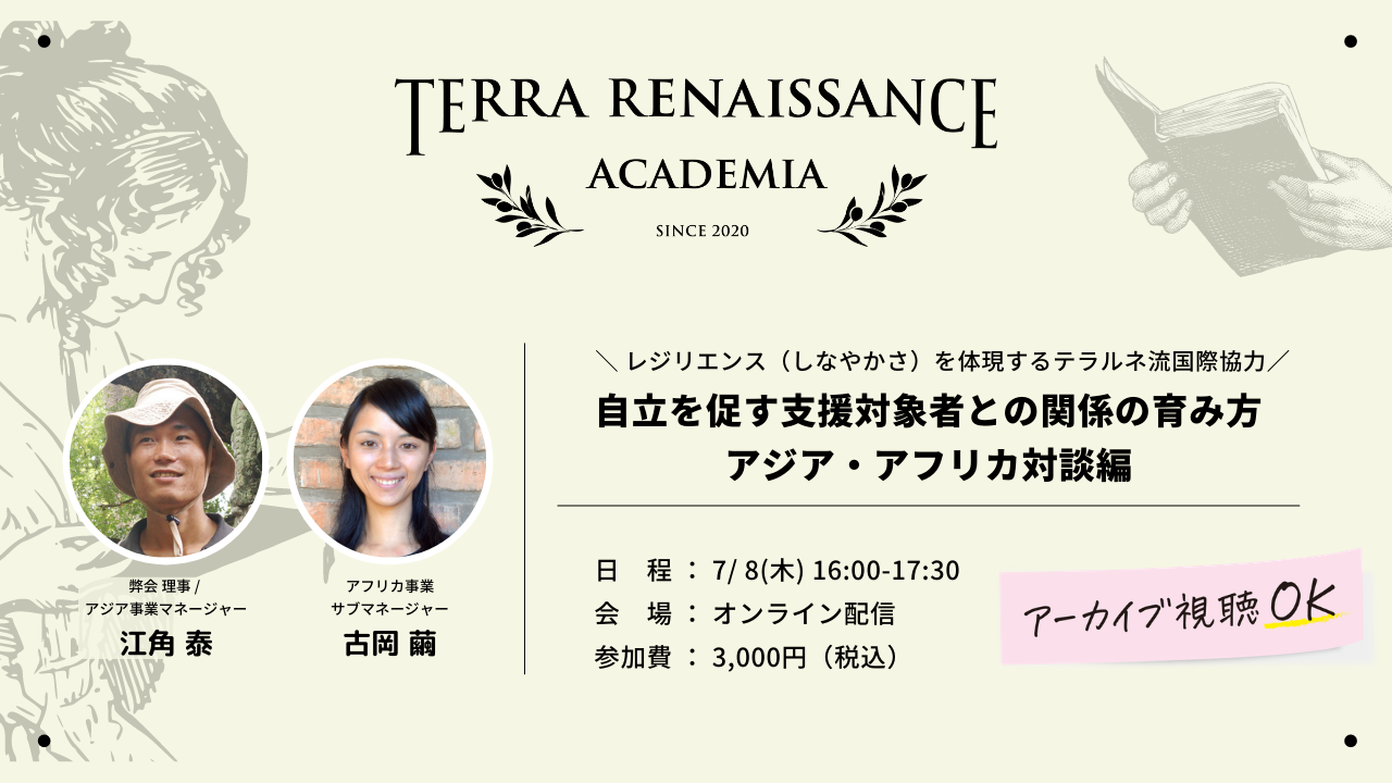 【Terra Renaissance Academia2021】「レジリエンス(しなやかさ)を体現するテラルネ流国際協力ー現地スタッフのオーナーシップを育む事業運営」【オンライン/アーカイブ視聴可】