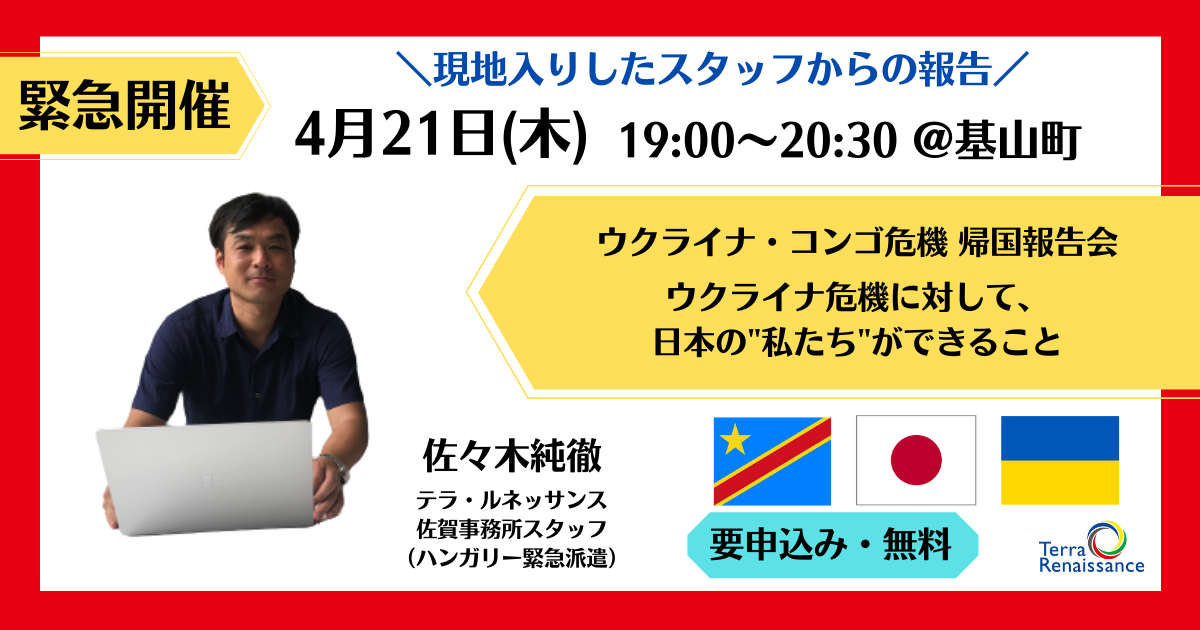 【 4/21(木) 佐賀 】ウクライナ・コンゴ危機緊急支援・帰国報告会(第26回 テラ・カフェ in 佐賀)