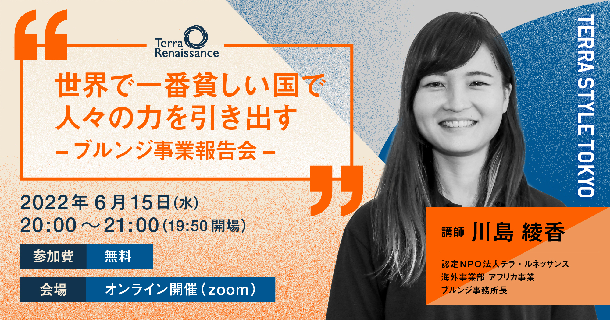 【 6/15(水)@オンライン 】世界で一番貧しい国で人々の力を引き出すーブルンジ事業報告会(第103回テラ・スタイル東京)