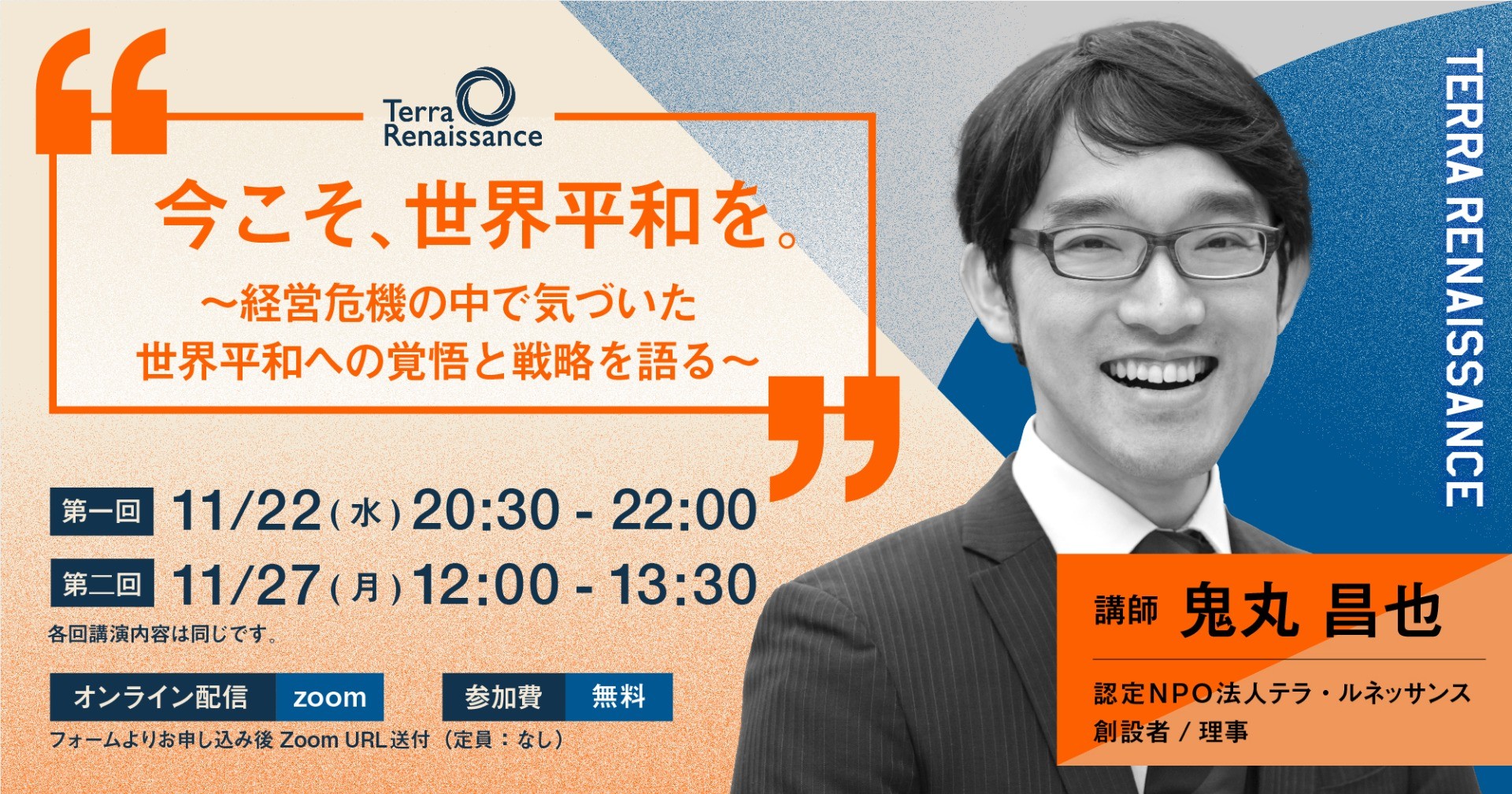 【11/22(水)&11/27(月)@オンライン】今こそ、世界平和を。〜経営危機の中で気づいた世界平和への覚悟と戦略を語る〜