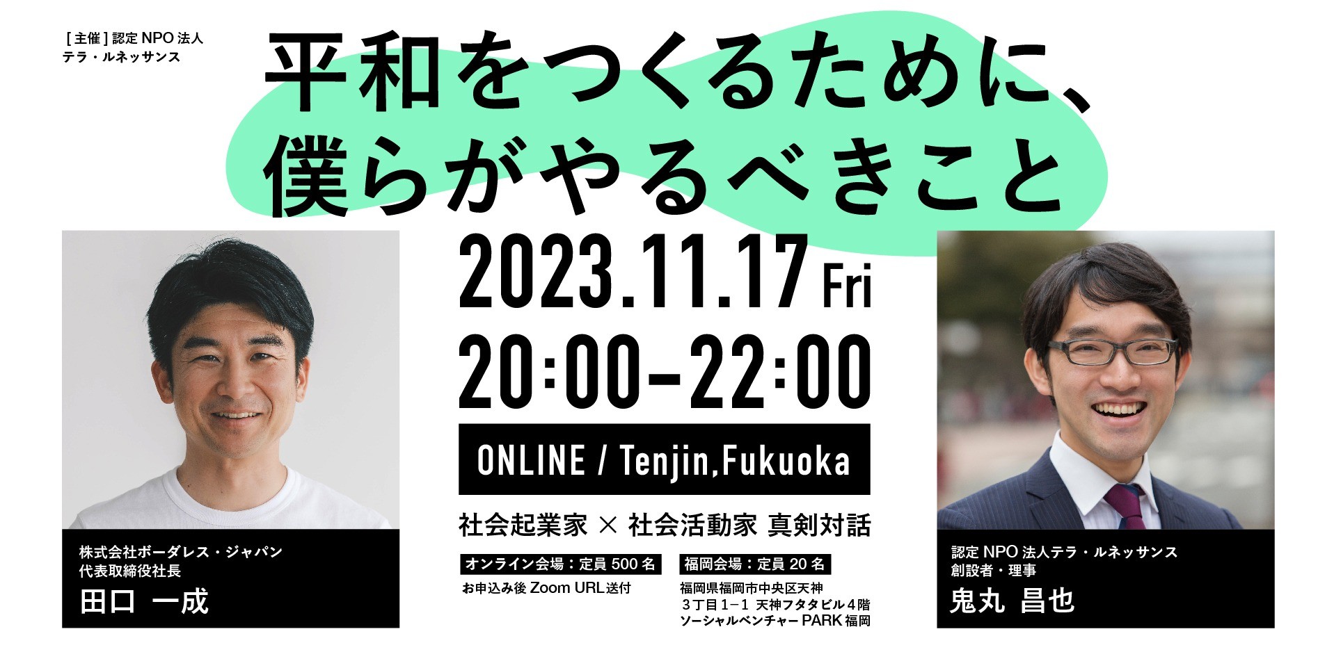 【11/17(金)@オンライン&福岡】社会起業家と社会活動家が真剣対話「平和をつくるために、僕らがやるべきこと」