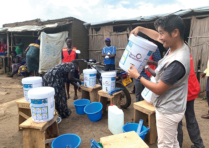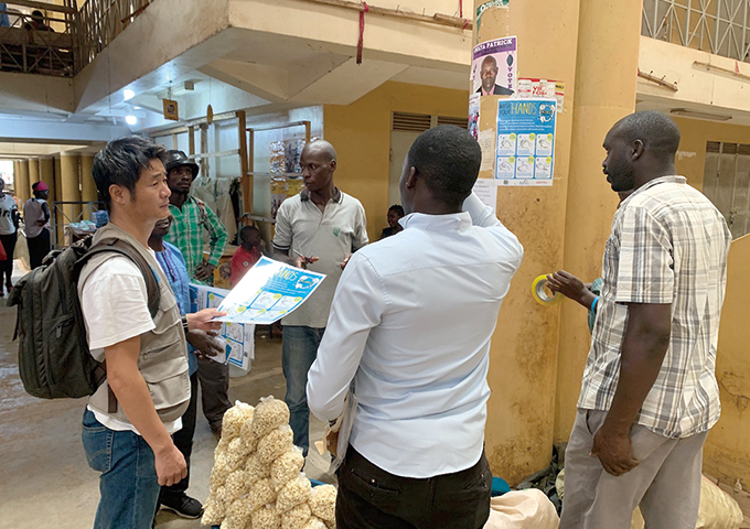 医療体制が脆弱なうえ衛生環境が十分に整っていない状況から、感染予防のための啓発活動や衛生用品の配布などを行ってきました。これまで難民居住区や人が密集する市場など1,293カ所に手洗い設備を設置し、74,628個の石鹸を難民や貧困層の方々に配布することができています。