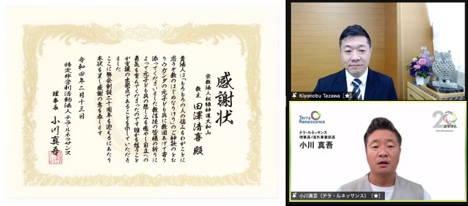 支えてきてくださった全ての方々に感謝状をお渡ししたかったのですが、今回は特に関係の深い支援者、団体、グループから8名の方々にお贈りさせていただきました。贈呈後にはお一人ずつから、懐かしいお話を交えつつ、テラ・ルネッサンスへのあたたかいお言葉やメッセージ動画をいただきました。