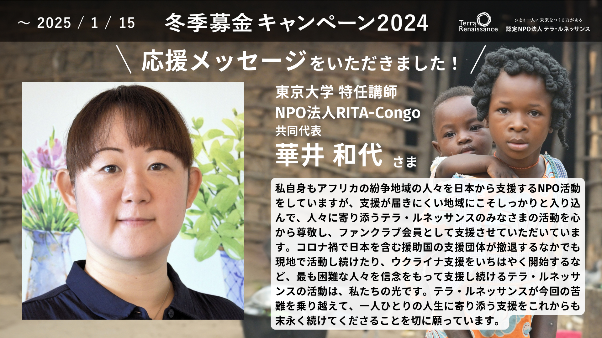 【応援メッセージ】東京大学特任講師/NPO法人RITA-Congo共同代表 華井和代さま