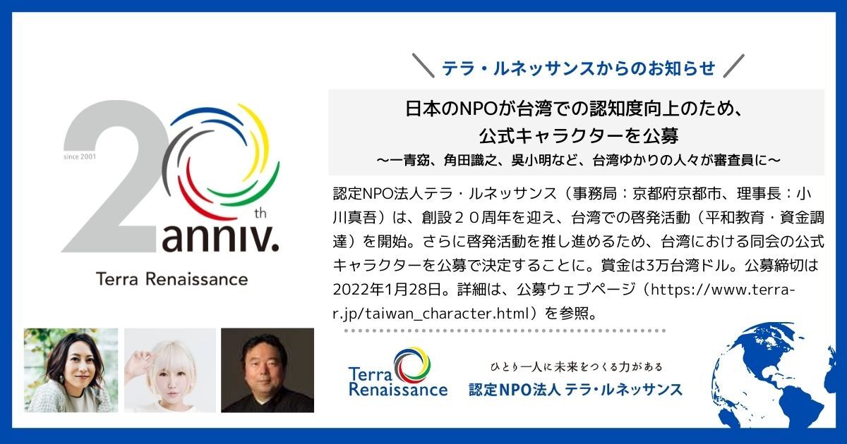 プレスリリース/日本のNPOが台湾での認知度向上のため、公式キャラクターを公募一青窈、角田識之、吳小明など、台湾ゆかりの人々が審査員に